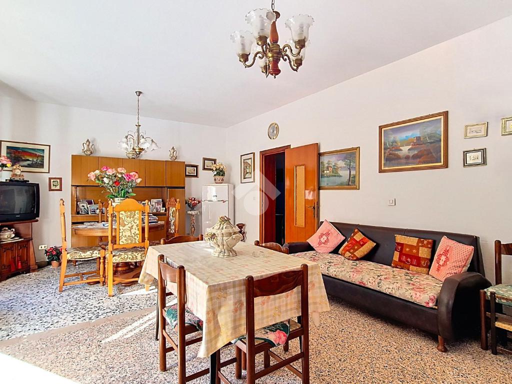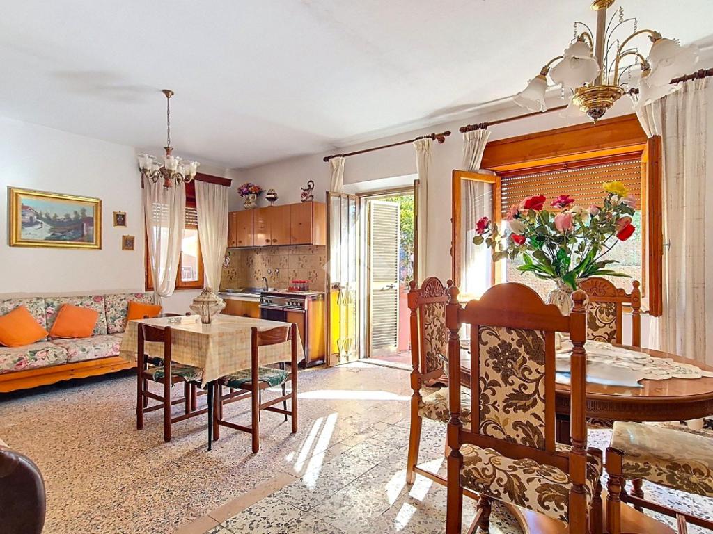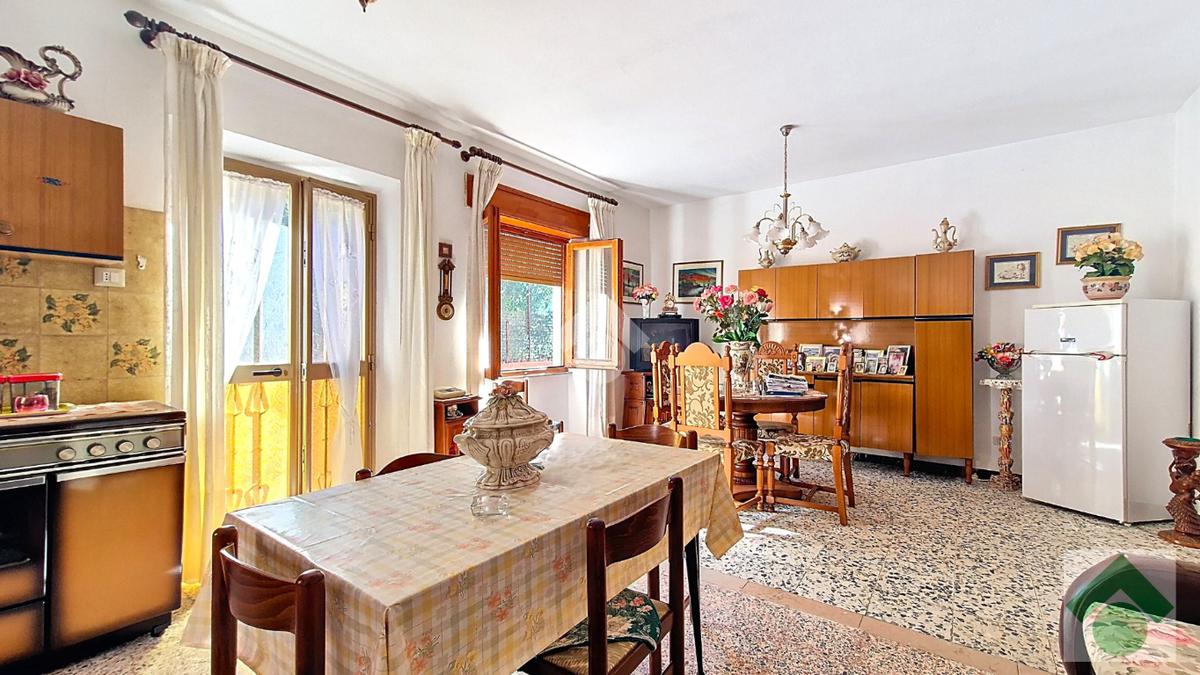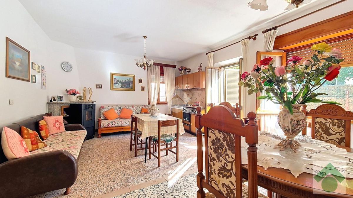 Situata al piano terra rialzato, la casa si distingue per gli spazi ampi e ben distribuiti. L’ingresso si apre su un comodo disimpegno centrale che conduce ai vari ambienti: un salotto luminoso, due camere da letto matrimoniali, un bagno finestrato, un soggiorno con cucina e un pratico ripostiglio.