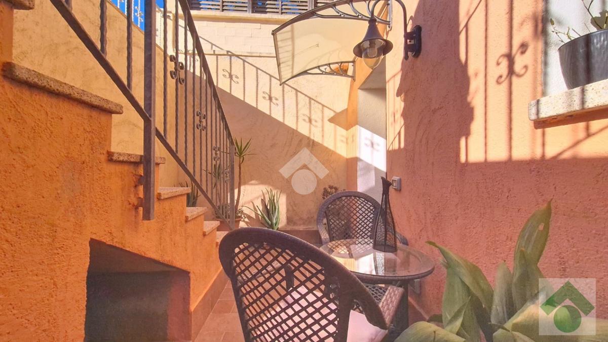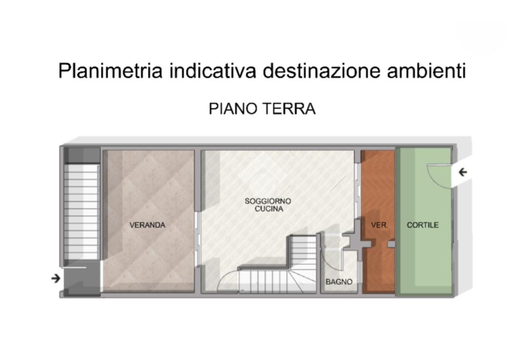 Accediamo alla proprietà tramite un cortile privato che conduce a un luminoso soggiorno con angolo cottura e un bagno di servizio. Completa il piano una veranda esterna.